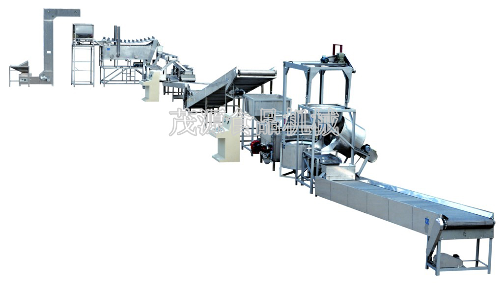 花生米自動油炸生產線的主要設備:提升機、燙漬機、脫皮機、揀選帶、晾干帶、油炸機、脫油機、拌料機。